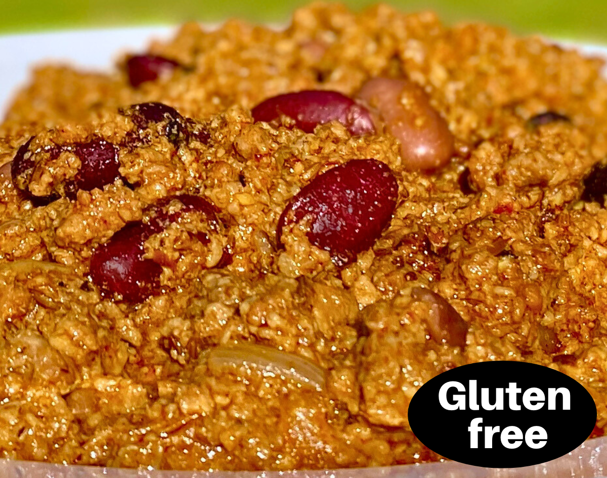 Vegan Con CarneNo meat or animal products. Vegan. A reworked Texas recipe for those who eat 100% vegan. This flavour-packed dish bursts with spices, a hint of chilli, black beans, pinto beans, red kidney beans, sautéed rice, and corn — all delivering natural, satisfying flavour.